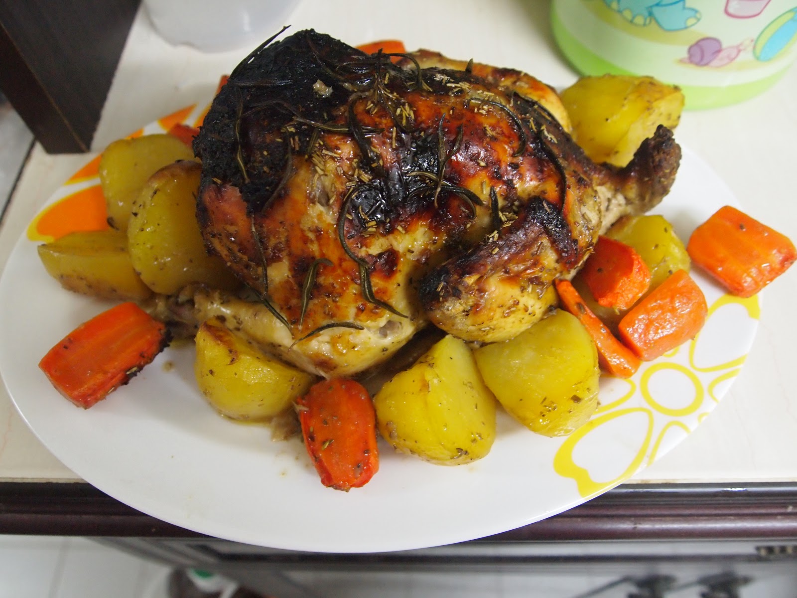 Oven Roasted Chicken with Rosemary menu diet Rosemary lebih banyak dibanding yang lain ya supaya lebih menonjol rasanya ayam utuh Baby potato Wortel bawang bombay potong 4 bawang putih potong bagi 2 oregano thyme. Guna halia muda banyak banyak lagi sedap. Jadi sambil menggoreng nasi ayam sudah siap diperap sebab ayam goreng berempah ni lagi lama diperap lagi sedap sebab rempah sudah mesra dengan ayam.