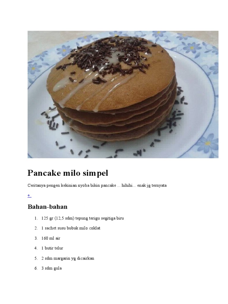 - 125 gr tepung trigu - 4 sdm gula pasir - 2 sachet milo - 12 sdm baking powder - 1 butir telur - 2 sdm mentega - 150 ml air. Cara membuat pancake milo. Kocok telur hingga berbuih kemudian tambahkan air dan kocok lagi.