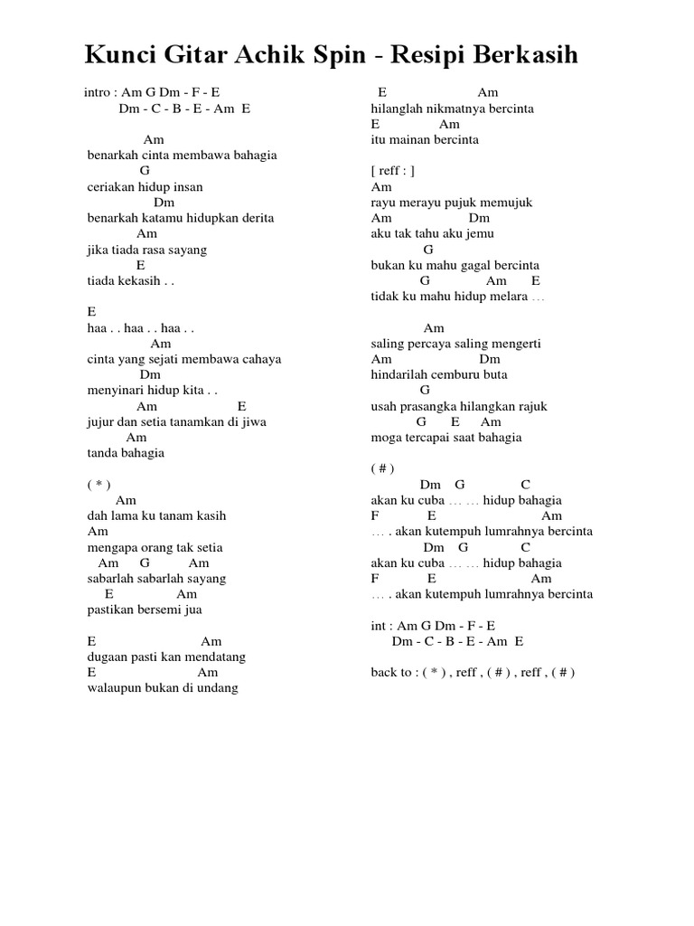 Lirik lagu resepi berkasih - lirik lagu resepi berkasih malaysia - lirik lagu resepi berkasih khai bahar - lirik lagu resepi berkasih spin - lirik lagu memori berkasih - lirik lagu gurauan berkasih - lirik lagu memori berkasih chord - lirik lagu resipi berkasih - lirik lagu resipi berkasih achik spin - lirik lagu resipi berkasih. TIPS PENCARIAN LIRIK FAVORIT ANDA. Dm Gm Ingin ku sentuh hatimu sayang dalam rinduku C F Moga kau tahu hebatnya cinta di hati ini Dm Gm Sekian lama memendam cinta C Dm Payah ku rasa menyeksa jiwa.