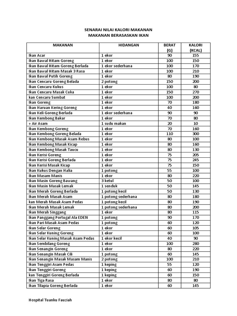 Terdapat 200 kalori dalam Ikan Tongkol Goreng 100 gram. BUKAN VEGETARIAN NASI MEE BIHUNKUETIAU DAN LAIN- LAIN Makanan Hidangan Berat g Kalori kcal Bihun bandung 1 mangkuk 450 490 Bihun bandung sayur 1 biji telur rebus 1 mangkuk 250 350 Bihun goring 2 senduk 170 290 Bihun goreng sayur fish cake 2. Ikan kembung masak kicap.