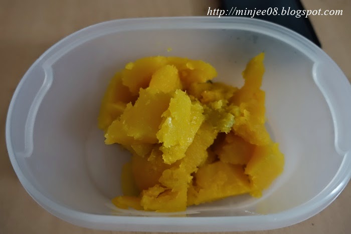 1 sdm minyak ikan dan 1 sdm labu kuning potong.
