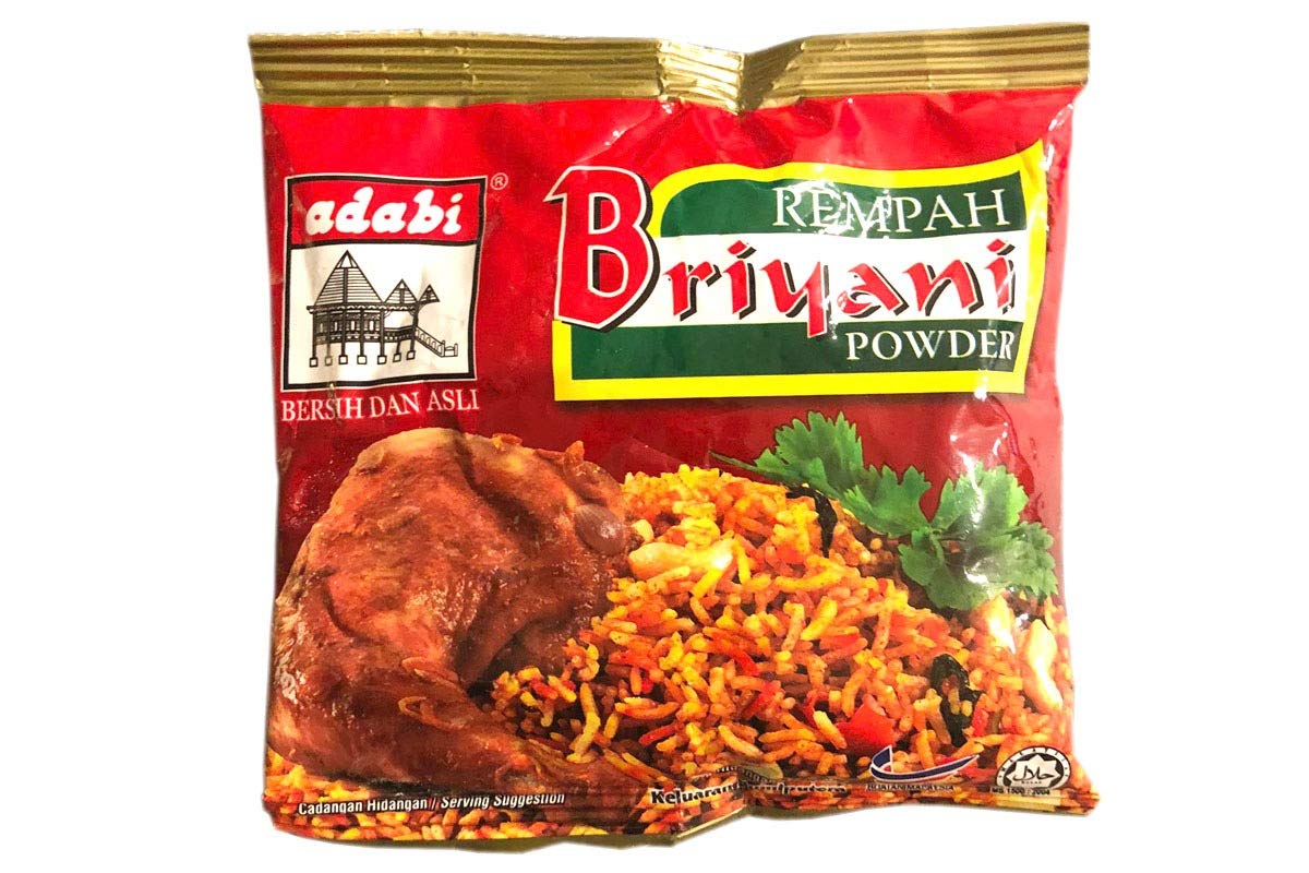 Bahan-bahan Beras basmathi Halia bwg besar dihiris Rempah tumis Perencah Nasi Briyani Adabi Myk ghee planta Serbuk kunyit KismisCara membuatn. Sepaket perencah nasi briyani cap maggi 3 sudu besar minyak sapi isi ayam di potong dadu suka hati nak letak banyak mana. Bila dah masak saya letakkan daun ketumbar untuk naikkan aroma nasi briyani.