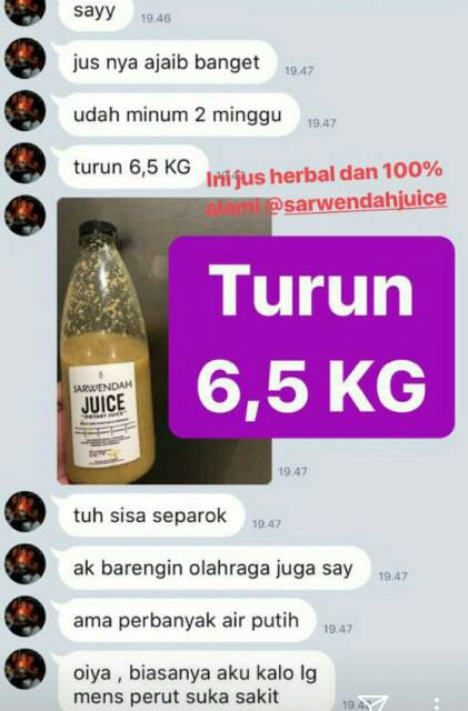 Sarwendah Juice merupakan juice herbal untuk kesehatan terutama banyak digunakan untuk yang ingin memiliki tubuh yang langsing dan sehat. Jus ini disarankan buat yang tidak suka minum suplemen pelangsing dan mau langsing sehat alami 100 Aman untuk bumil. Sarwendah mengatakan ia selalu mengonsumsi jus dengan campuran aneka bahan alami.