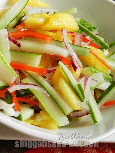 12 biji nanas potong kecil. 1 biji nenas dipotong 2 biji timun dibuang kulit dan dipotong 12 batang carrot dipotong 2 biji cili merah dihiris 2 biji cili hijau dihiris 5 biji cili api dihiris 2 biji bawang besar dihiris 2 sudu besar cuka Garam dan gula secukupnya Cara-cara. Timun dan lobak merah dipotong memanjang.
