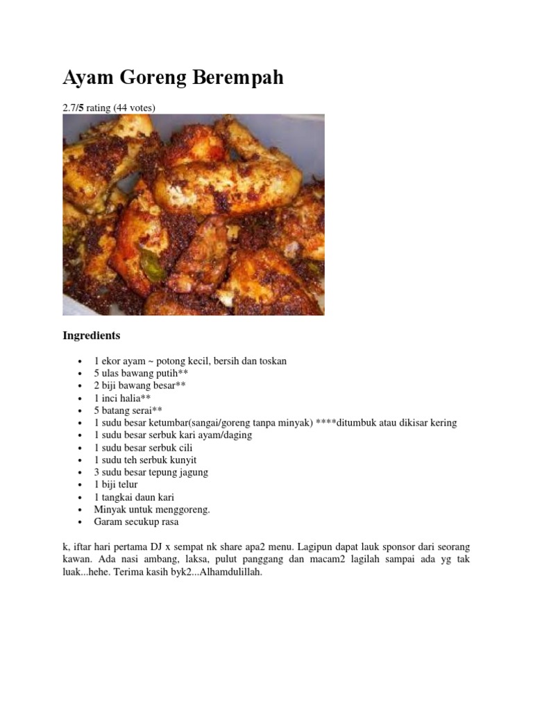 2 batang serai 2 hiris lengkuas 1 sudu jintan manis 1 sudu ketumbar biji 1 bawang besar 2 bawang putih 1 ketul kecil kunyit 12 cawan air 1. Keistimewaan resepi ayam goreng berempah ni pada serai yang ditumbuk berasingan menjadikan tekstur serdak dan bertali membuatkan nya sedap dan rangup apabila digoreng. Sedap juga jika dimakan bersama nasi putih yang panas begitu sahaja.