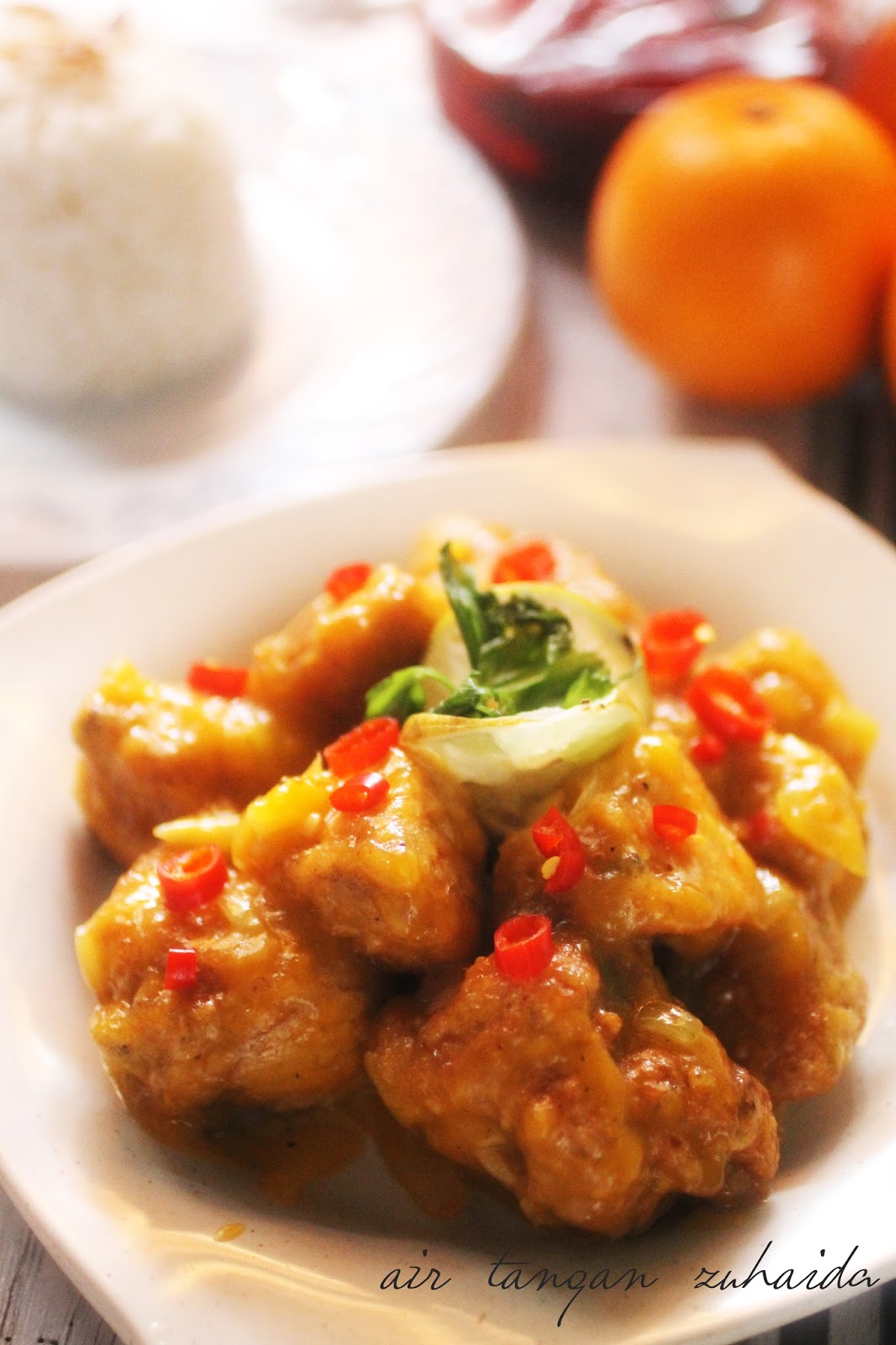 Akhir sekali masukkan ayam yang telah digoreng tadi. 1 keping dada ayam 3 sudu penuh tepung jagung 1 biji telur 1 kiub ayam 1cawan air 3 sudu gula Perahan jus lemon 1 biji Lada sulah Garam Ajinomoto secukup rasa 1 inci halia dihiris halus Daun bawang. Kemudian masukan bancuhan tepung jagung dam kacau seketika sehingga sos pekat.