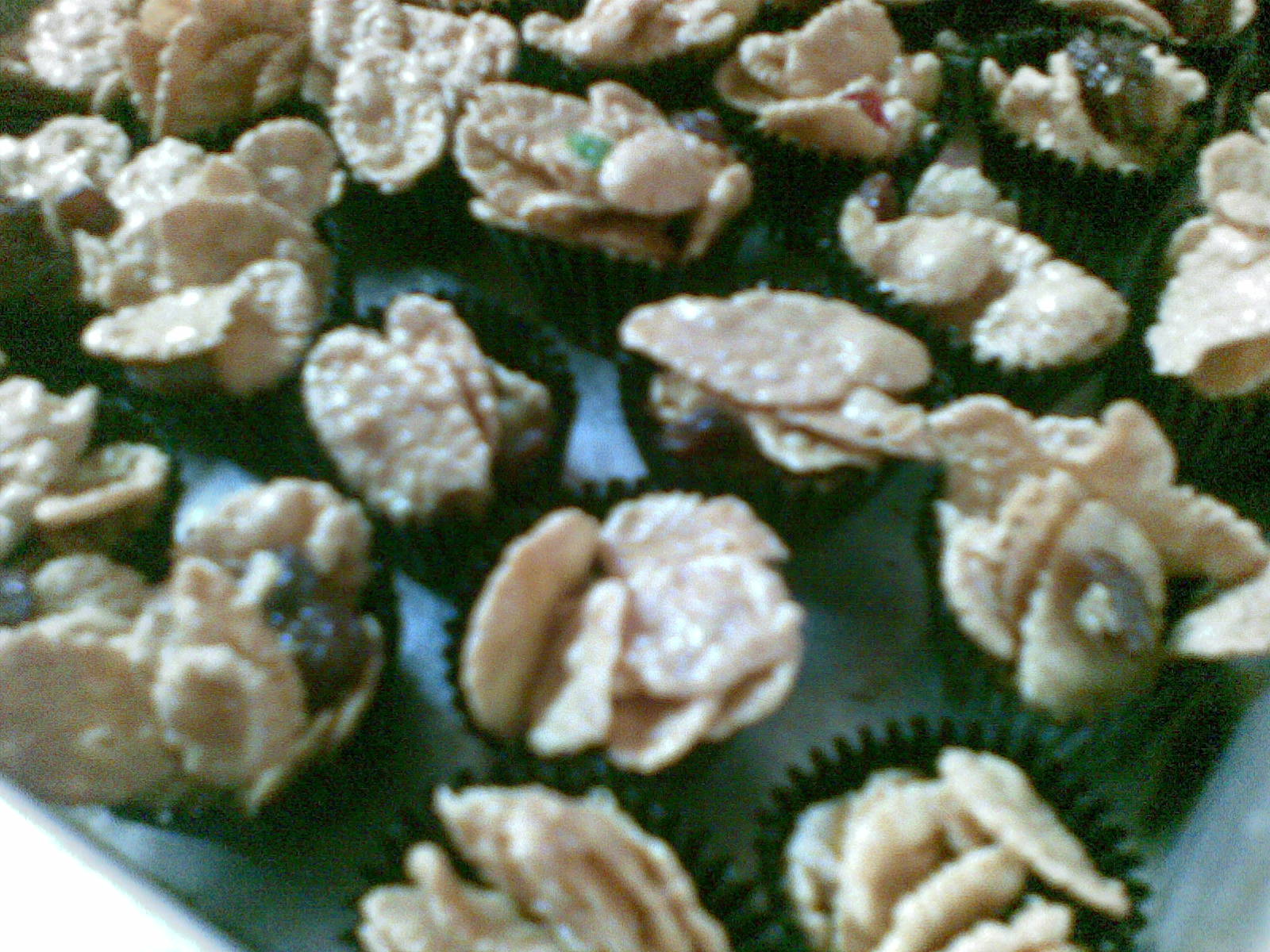 Anak-anak lebih suka yang ini. Masukkan pula 250 gm cornflakes dan gaulkan sebati. Sudukan ke dalam paper cup dan hias.
