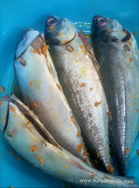 Eh puji diri sendiri la pulak yer. Ikan Cencaru dibelah belakang dan dibersihkan. Lumurkan separuh kunyit tadi pada ikanjangan lupa campur garam sekali.
