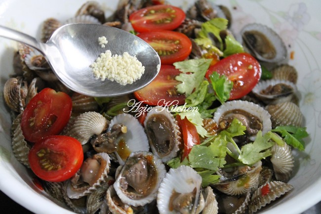 Resepi Kerabu Kaki Ayam 5. 1 kg kerang 10 biji cherry tomato Daun ketumbar secukupnya 4-5 ulas bawang putih tanpa dibuang kulit Cili padi ikut kepedasan masing2 yatie letak dlm 8-9bj pun dah pedas 1 biji. 2 biji limau nipis perah ambil air.