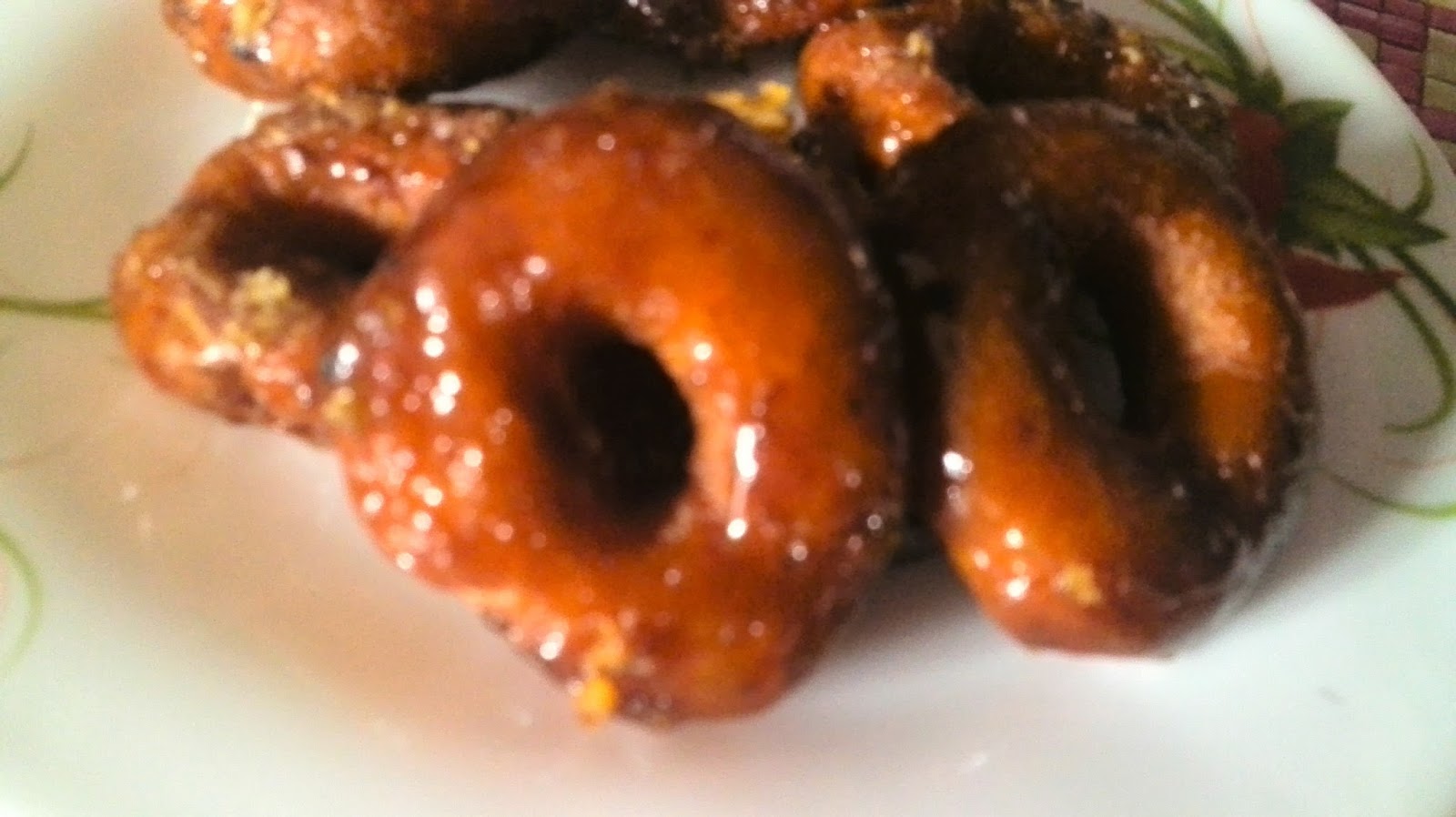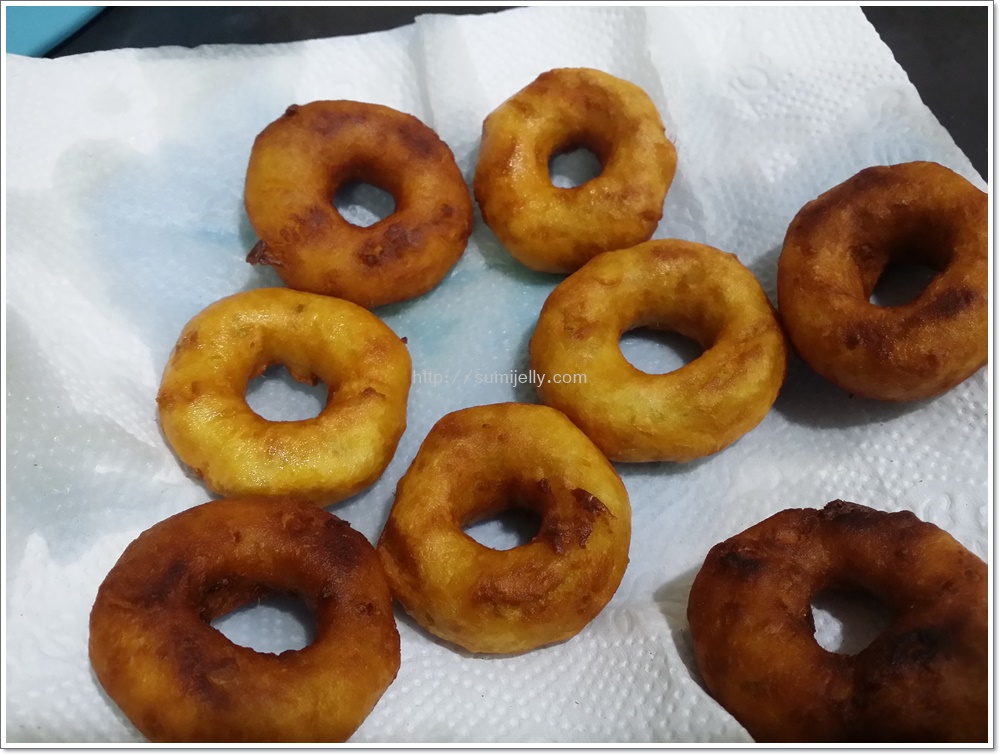 Bentukkan adunan keria jadi bentuk bulat. Apabila air gula bersalut rata di kuih keria taburkan sedikit tepung gandum supaya ia tahan lama dan tidak mudah cair. -Dah sejuk br masukkan ikan bilis kacang tanah goreng.