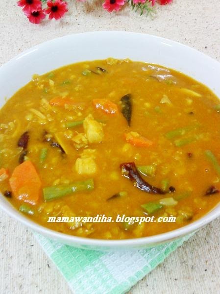 Kuah dal-rebus kacang dal sehingga lembuttumis bawng merah bawang putih dan daun kari dalam periuk gaul skjap hingga naik baumasukan pes rempah kari ikan yg dah digaul dengan air tadi gaul masukan sikit air agak2 dah gring skit masukan kacang dal dan gaul lagi them masukan santan dan tambh air sikit perasakn dengan gulagram dan serbuk perasa masak sehingga pekat. 3 biji kentang kupas kulit dan potong 4. Kuah kacang dhal yang Nik buat ni ringkas sahaja.