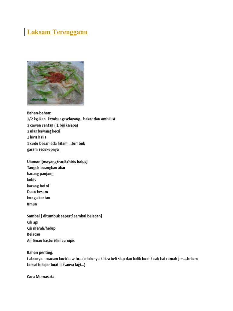 Perlu ada sedikit kesabaran je. Tiap kali balik kampung mesti dia minta kakaknya buatkan laksa kuah putih atau laksam. 332019 Laksa Terengganu adalah sejenis hidangan berkuah seperti mi yang terkenal di Terengganu.
