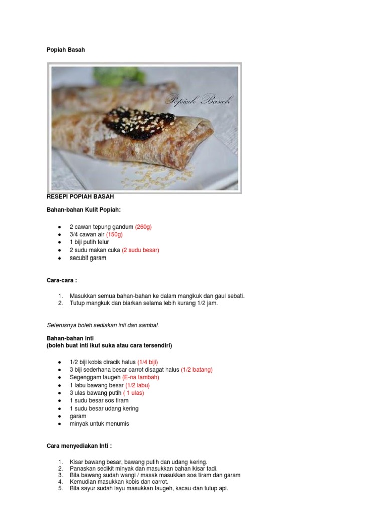 Kali ini kami kongsikan kepada anda resepi mudah untuk membuat popia basah. 34 cawan air. Sapukan sos di permukaan kulit popia hingga rata.