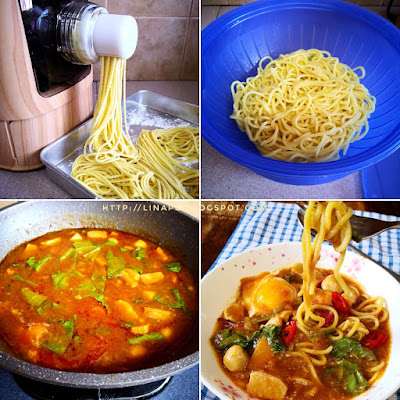 3 bungkus mee sanggul rendam dalam air Udang 5 biji telur. 3 bungkus mee sanggul. 1 senduk Sos tomato.