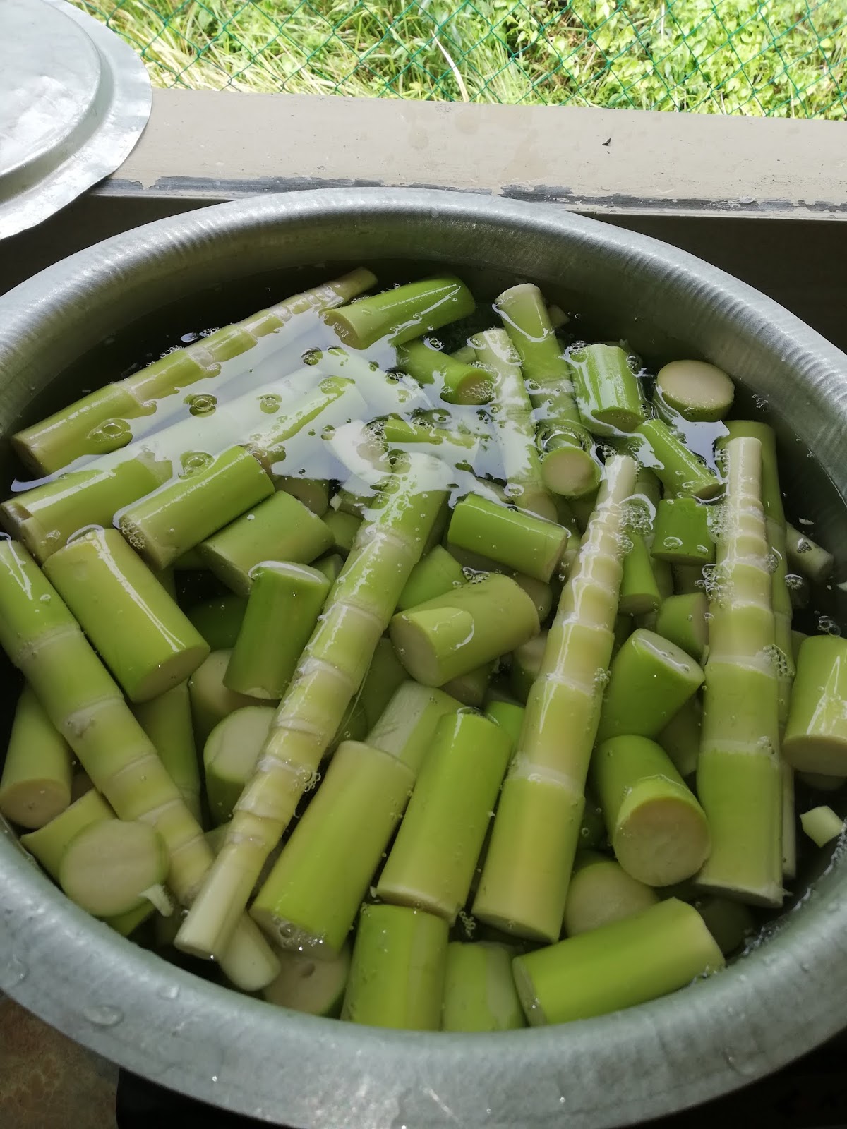 1 genggam ikan bilis 1 biji bawang besar 1 ulas bawang putih 5 biji cili api cili hijau n merah Minyak sikit. 300 gm rebung dihiris dan dicelur kemudian toskan. Kacau lagi dan lagi sehingga kering dan sambal jadi gelap.