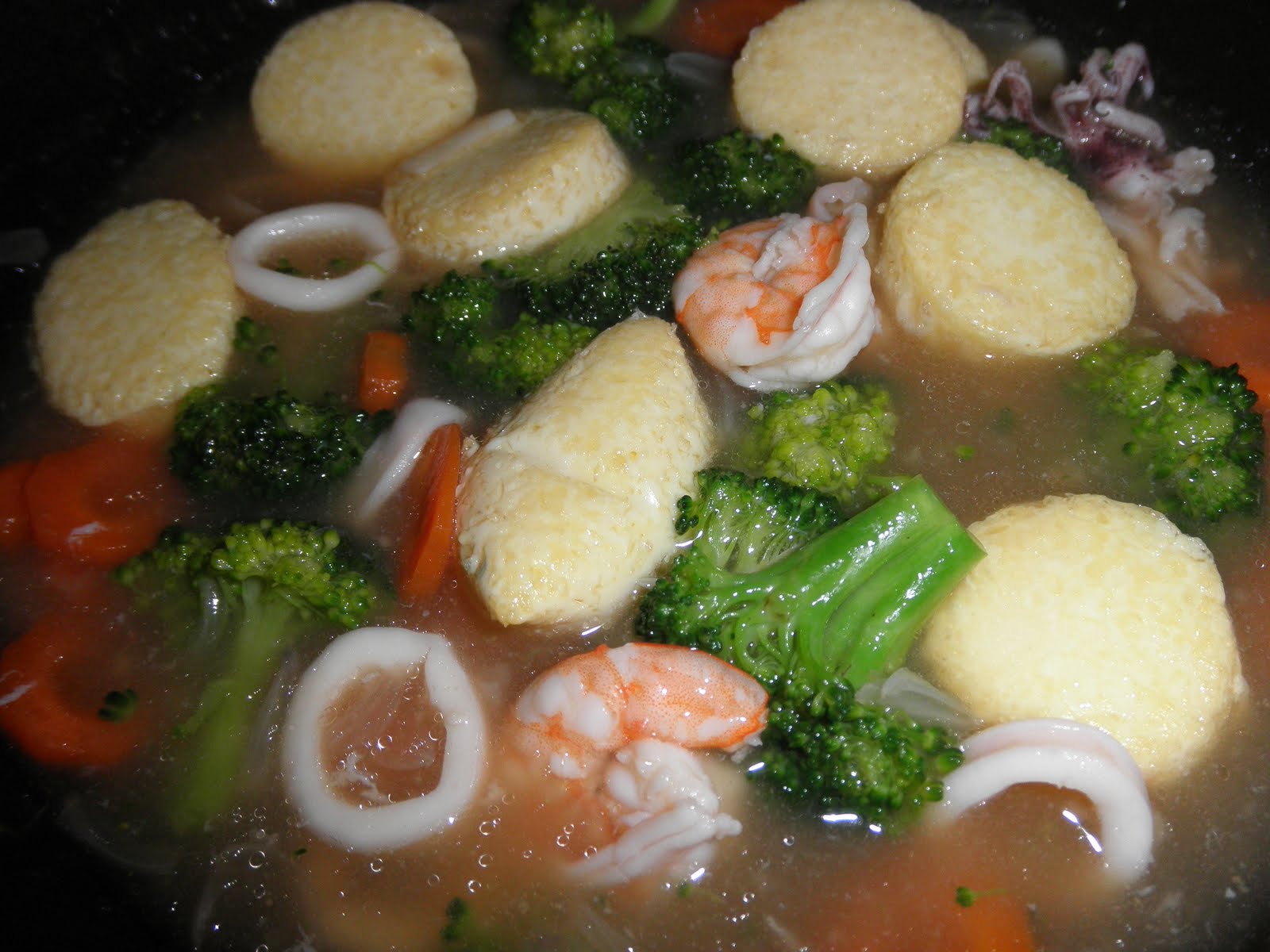Setelah secukup rasa masukkan tauhu jepun. Biarkan mereneh sebentar dengan api sederhana. Tauhu telor isi ayam potong nipis Brokoli Baby Corn Carrot kacang Peas tangkai Daun Bawang sudu besar serbok pati ayam Wan Sup tauhu.